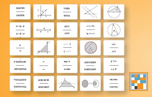 i drugom stupcu. Njegova asocijacija je: “KOORDINATNI, 2”. Suigrači nakon međusobnog dogovora dotaknu karticu u prvom retku i drugom stupcu koju kapetan pokriva. Nakon toga, igrači dotaknu karticu u trećem retku i petom stupcu budući da (a,0) predstavlja koordinate. Kapetan protivničkog tima pokriva karticu plavom bojom. Narančasti tim gubi red, a kapetan plavog tima daje asocijaciju: “VISINE, 2”. Njegovi suigrači primjećuju da je na slici u prvom retku i petom stupcu označena visina trokuta pa dotaknu taj pojam. Nakon toga se sjete definicije ortocentra i uspješno pogode i drugi pojam. Budući da je kapetan dao asocijaciju na dva pojma, prepuštaju red drugom timu. Nasumično gađanje se ne isplati.